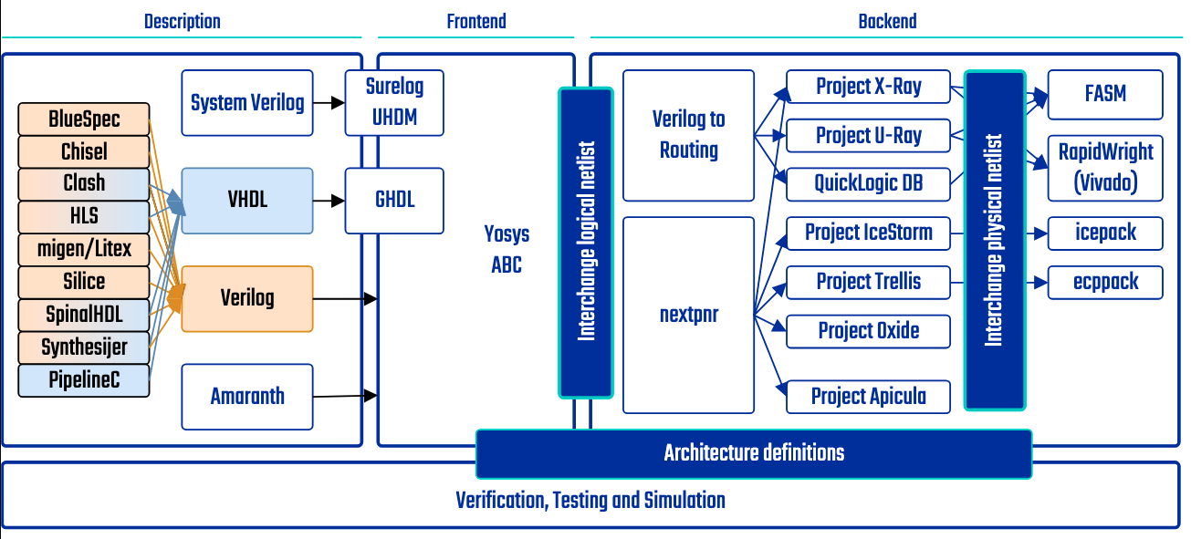 F4PGA currently (2025) targets Xilinx’s 7-Series, QuickLogic’s EOS-S3, and Lattice’ iCE40 and ECP5 devices. Think of it as the GCC of FPGAs.