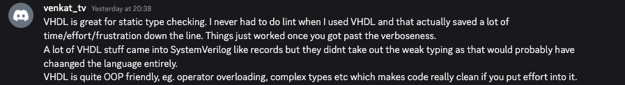 VHDL appears to be a shrinking market, but its static type checking is great for catching errors.